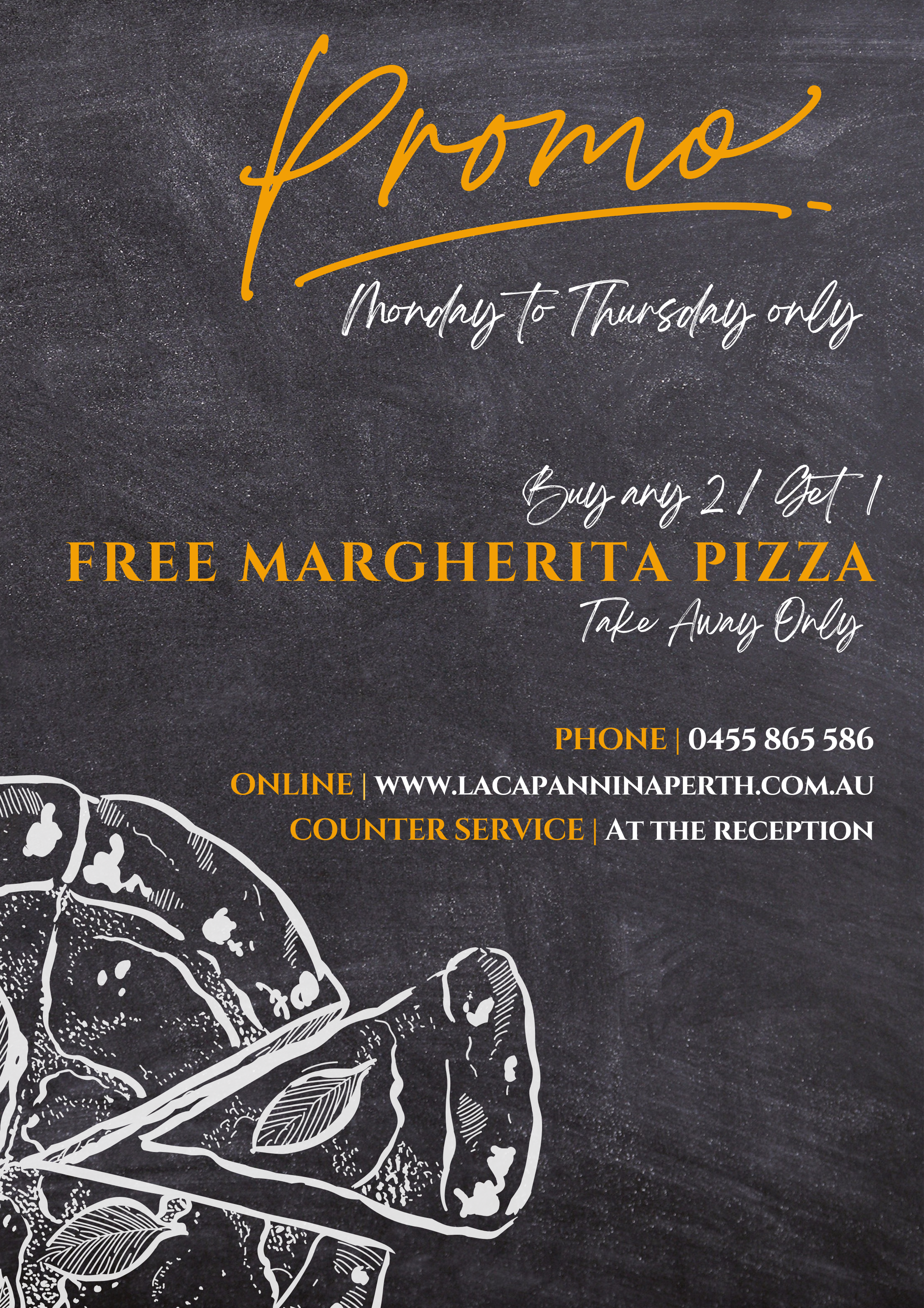 Enjoy your Free Take Away Margherita Pizza - Monday to Thursday All Day